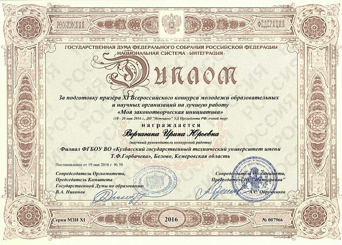 Поздравляем Верчагину Ирину Юрьевну с получением диплома за подготовку призера XI Всероссийского конкурса молодежи образовательных учреждений и научных организаций на лучшую работу «Моя законотворческая инициатива»