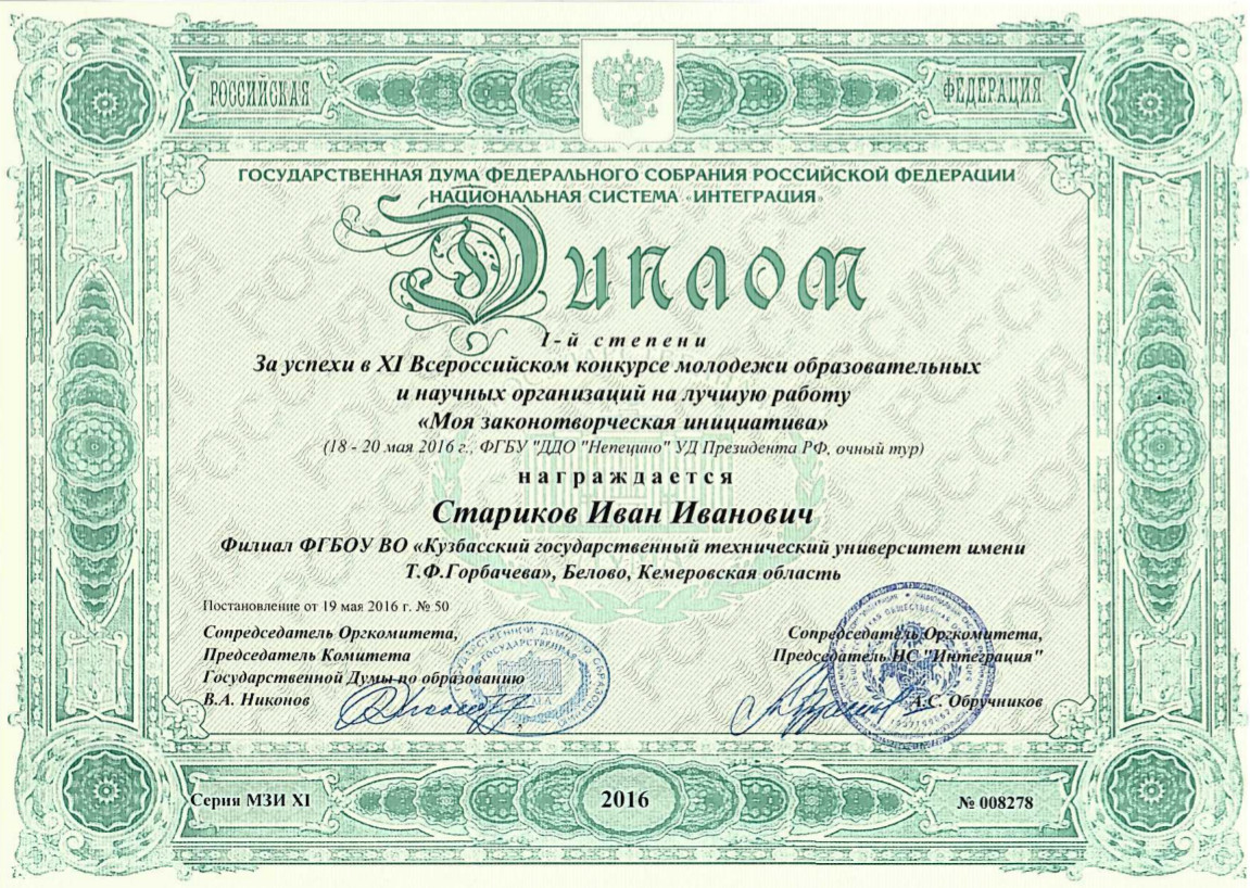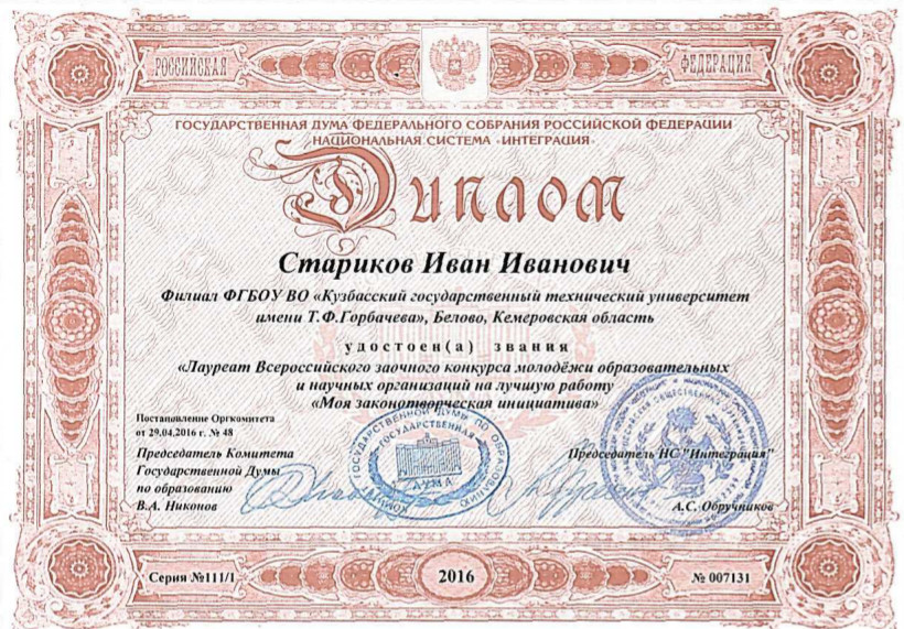 Поздравляем Старикова Ивана Ивановича студента группы ГОс-123 с получением диплома лауреата и диплома I степени XI Всероссийского конкурса молодежи образовательных учреждений и научных организаций на лучшую работу «Моя законотворческая инициатива» , награждением знаком отличия «Национальное достояние».